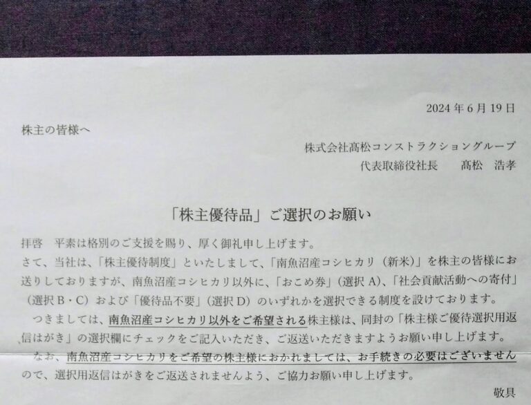 高松コンストラクショングループ (1762)優待申込み案内到着(3月末)