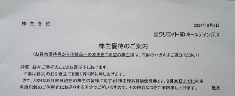 クリエイトSDホールディングス (3148)優待申込み案内到着(5月末)