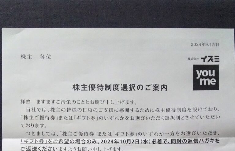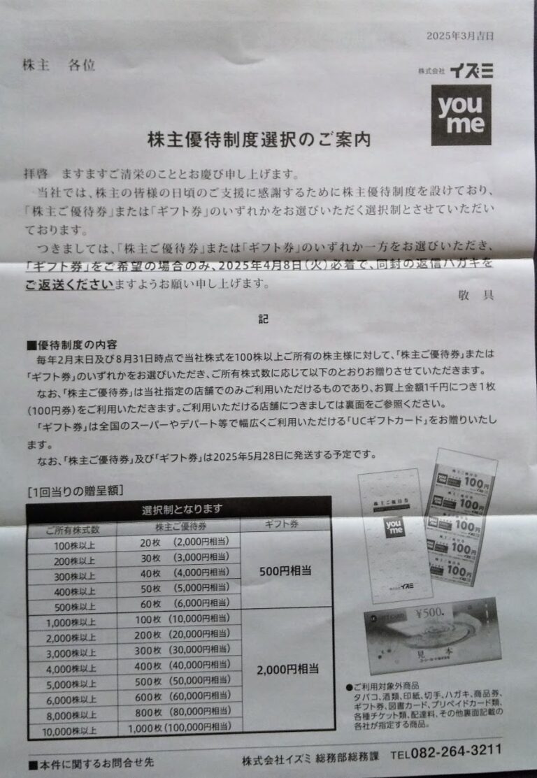 イズミ (8273)優待申込み案内到着(2・8月末)