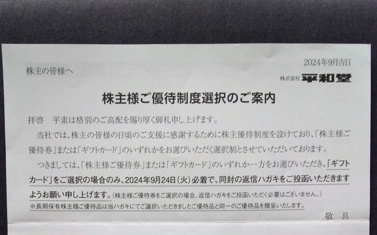 平和堂 (8276)優待申込み案内到着(2/20・8/20)