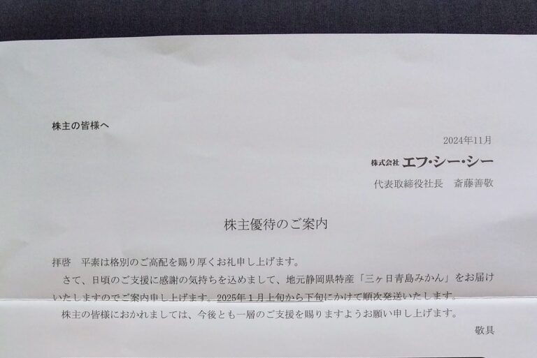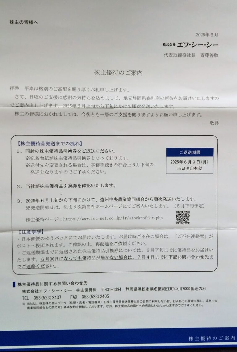 エフ・シー・シー (7296)優待申込み案内到着(3・9月末)