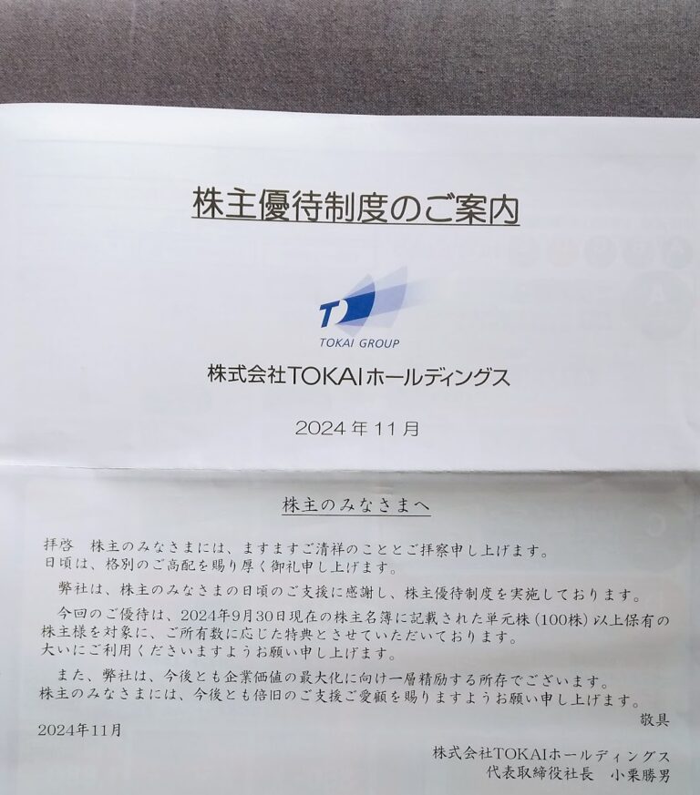TOKAIホールディングス (3167)優待申込み案内到着(3・9月末)