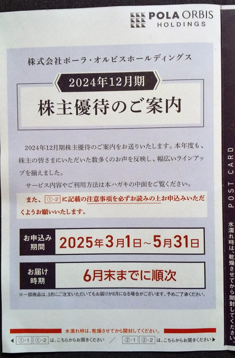 ポーラ・オルビスホールディングス (4927)優待申込み案内到着(12月末)